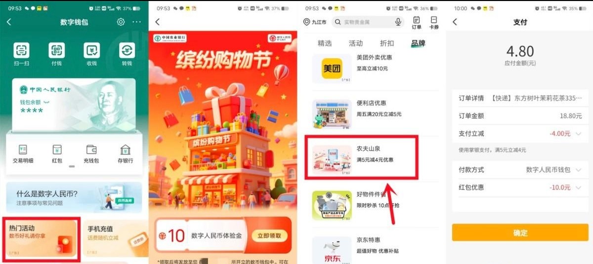 ———1、打开“中国农业银行”APP搜索【数字人民币】进去,点【热门活动】再点【数字人民币缤纷购物节】进去直接领10元数字人民币红包