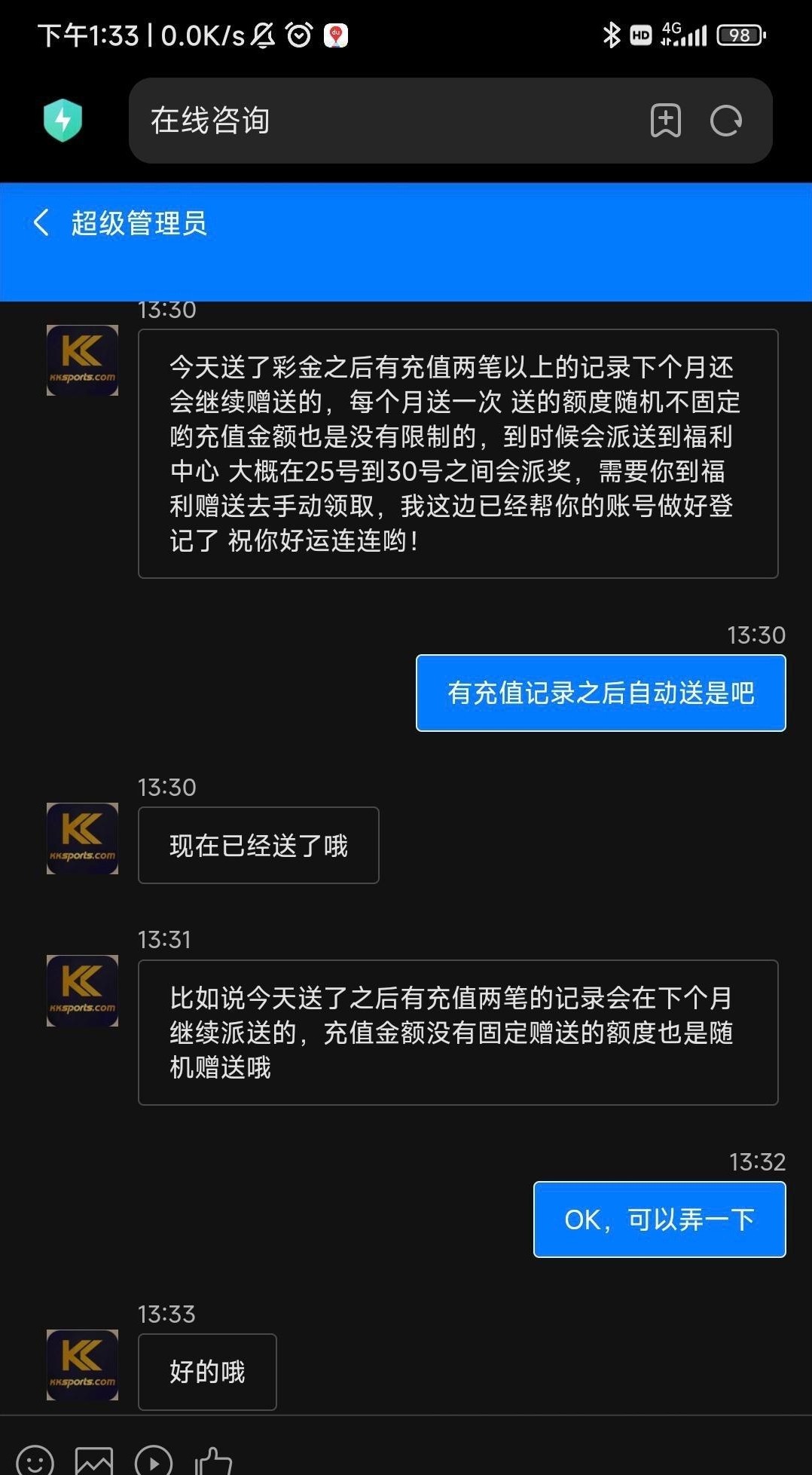 之前送三块打到100,这次打电话送了88打不上来 最好是有充值记录的上去看看,没有就无视 网址https://app.kkty5571.com/#/home